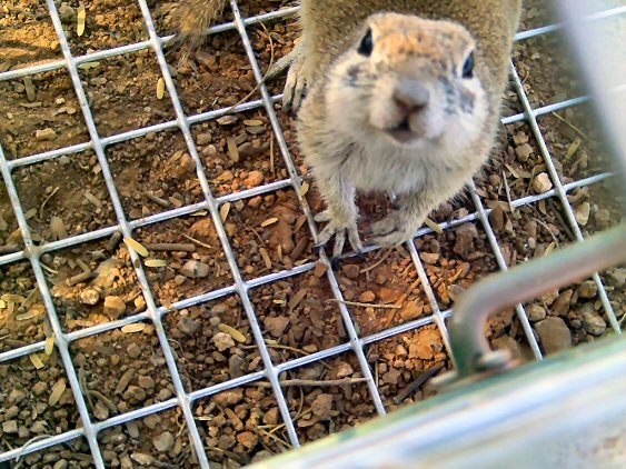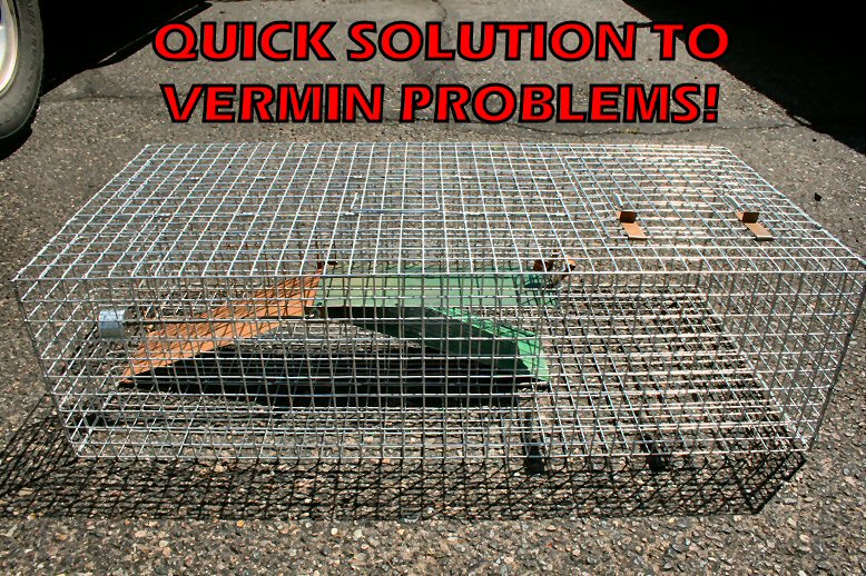 I have developed a cage trap that will catch multiple vermin without having to be emptied. The trap resets itself using a counter weight trap door system. Just place some bait in the small container inside the entryway and put the cage where you are seeing vermin traffic and come back later to a cage with several vermin in the dumping cage. To see additional pictures of the repeating vermin cages click here.